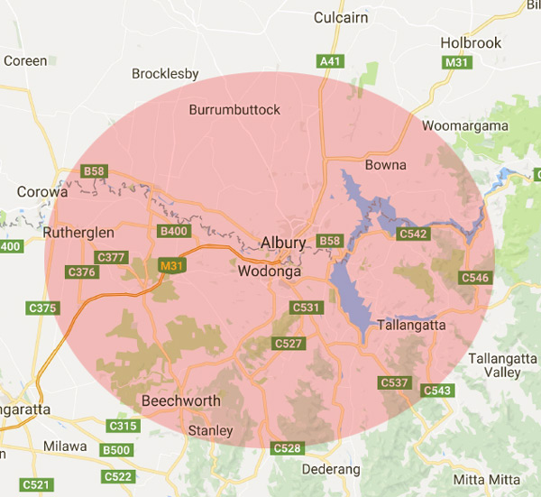 Albury, Wodonga, Lavington, Thurgoona, Beechworth, Rutherglen, Tallangatta, Corowa and surrounding areas.